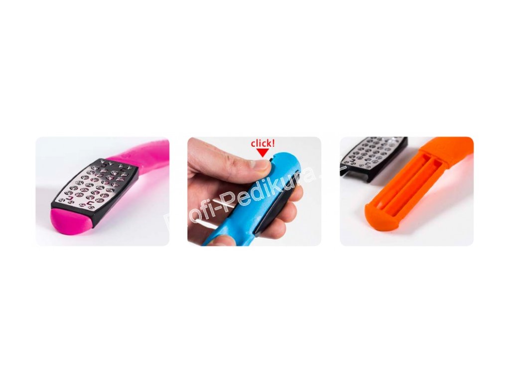 Rukoväť v príjemnej pastelovej farbe je ergonomicky tvarovaná a uľahčuje tak manipuláciu pri ošetrení nôh. Pred použitím pokožku zmäkčite. Povrch kože zanecháva jemný a hladký. Po použití opláchnite rašpľu pod tečúcou vodou.