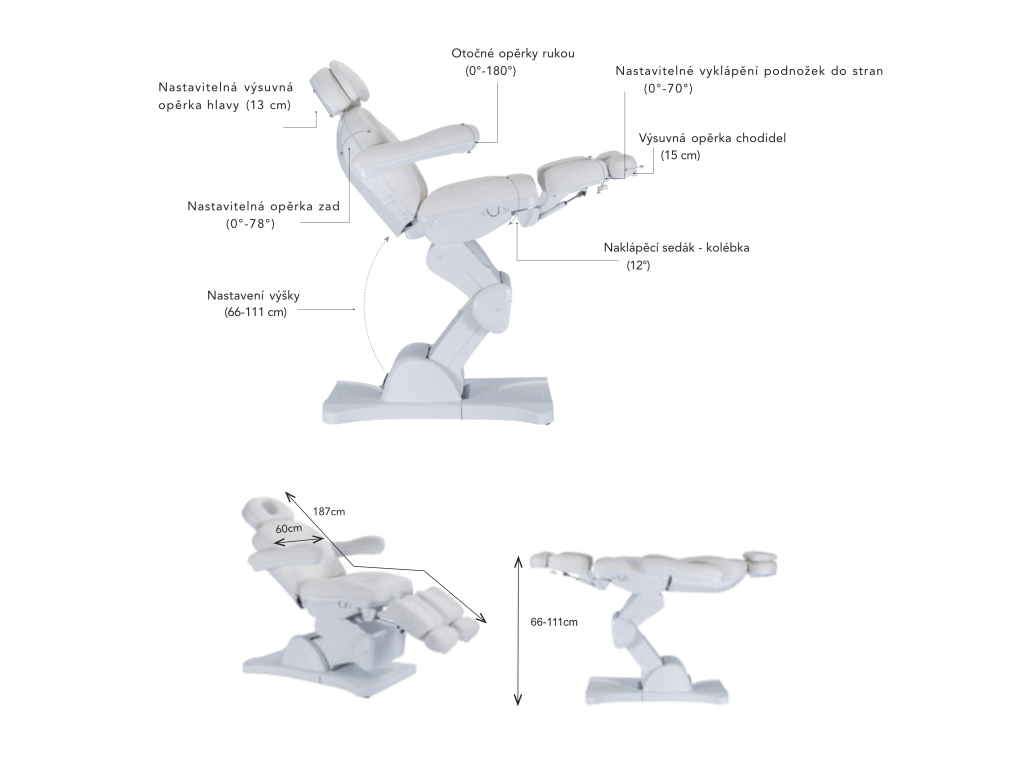 Kreslo je vybavené viacmotorovým elektrickým nastavením vďaka použitiu hneď 4 motorov, ktoré umožňujú veľmi plynulé polohovanie jednotlivých častí. Táto flexibilita uľahčuje prispôsobenie kresla rôznym typom ošetrení – či už ide o klasickú pedikúru alebo kozmetické procedúry.
