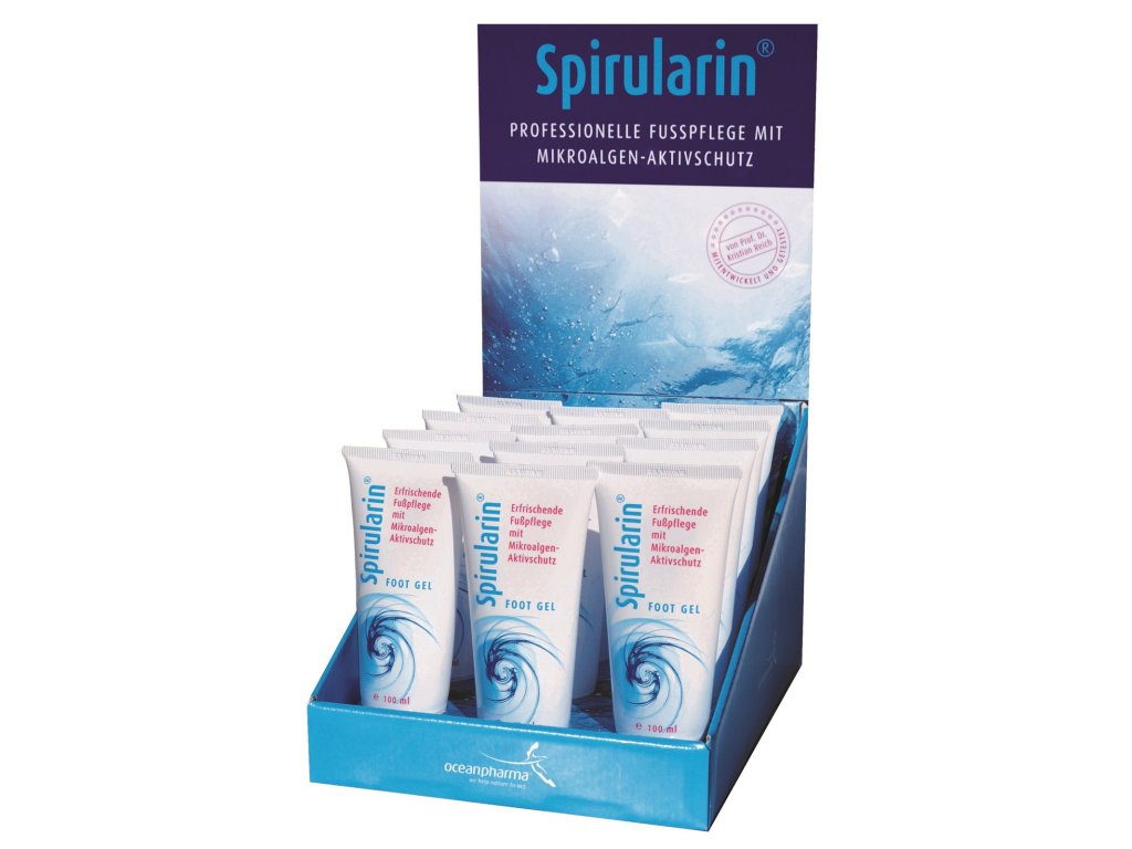 Cenovo zvýhodnená sada prípravkov SPIRULARIN na SUCHÚ POKOŽKU so stojanom, obsahuje 12ks Spirularin gél na suchú pokožku 100ml – unikátny prípravok na suchú pokožku a chodidlá extra hydratujúce s patentovanou zložkou Spiralin®