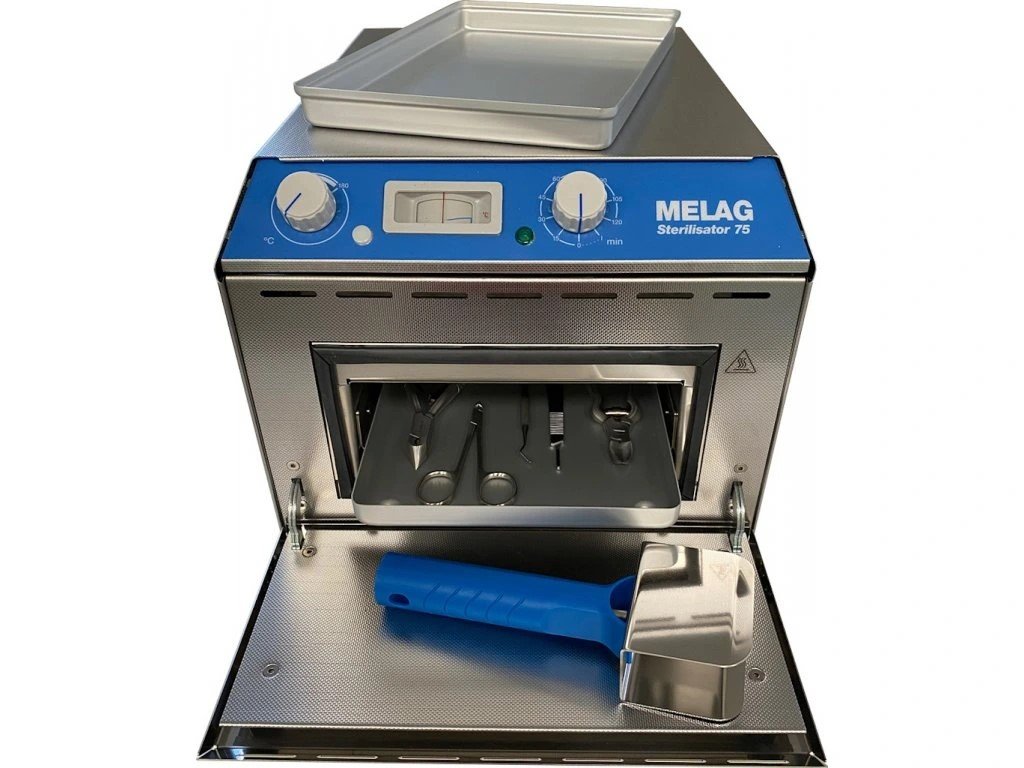 Horkovzdušný sterilizátor Melag 75 s nucenou cirkulací vzduchu. Odpovídá všem platným předpisům a zákonům ČR pro provoz v salónech a lékařských ordinacích. Přístroj je určen ke sterilizaci předmětů z kovu, skla, keramiky, kameniny apod.