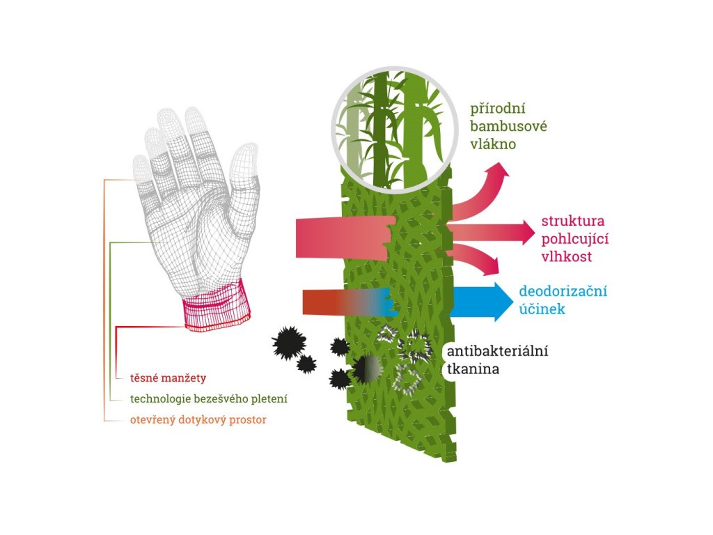 Jedinečné vlastnosti bambusových vlákien a špeciálna štruktúra pletenia umožňujú pracovať v rukaviciach dlho a opakovane bez toho, aby došlo k nepohodliu.