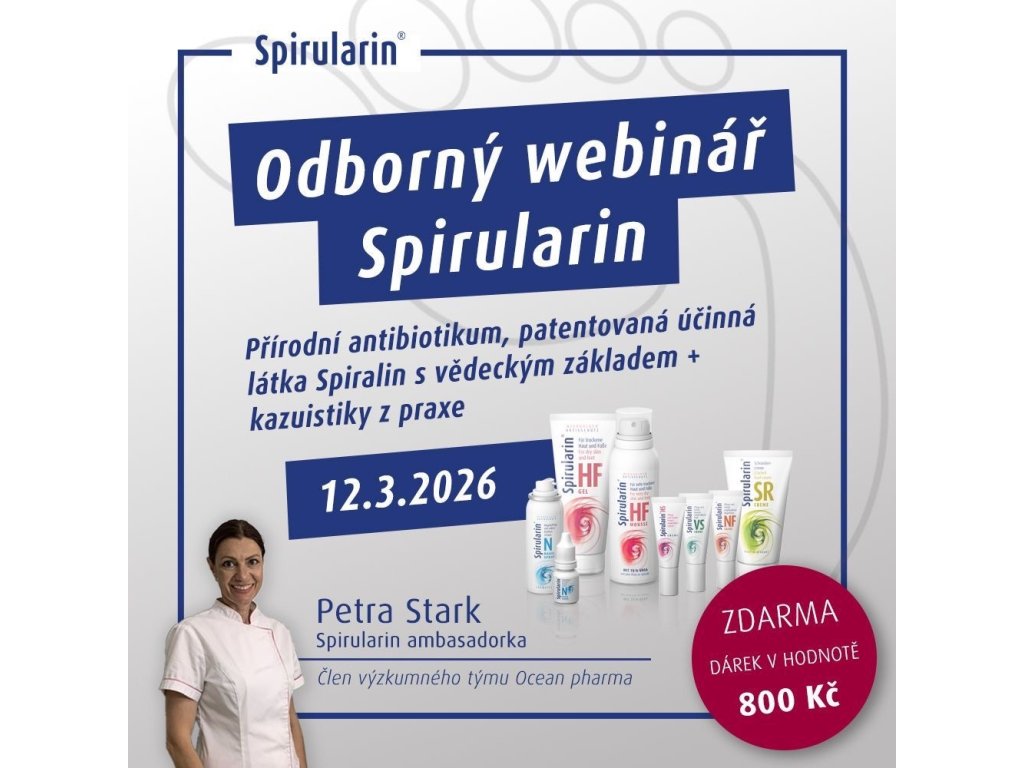 Poznejte sílu přírodního antibiotika – patentované účinné látky Spiralin, která stojí za výjimečnou účinností celé řady Spirularinu. Na webináři se zaměříme na vědecké principy působení Spiralinu, jeho antivirové, antibakteriální a regenerační vlastnosti, a ukážeme si praktické kazuistiky z pedikérské a podologické praxe.